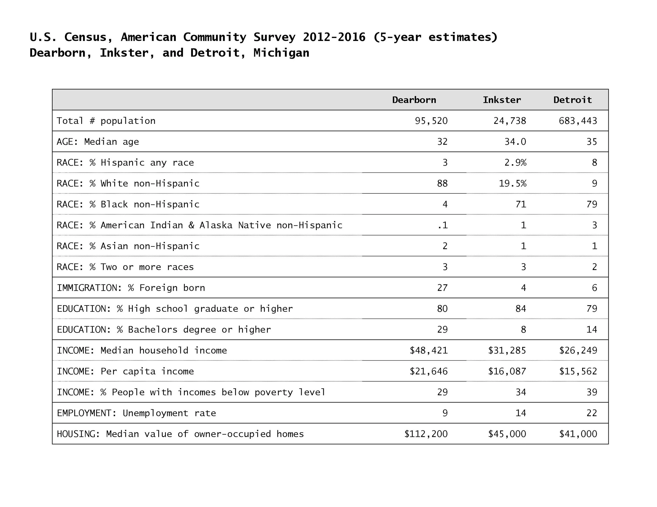 Since racial covenants and other forms of housing discrimination kept African Americans out of Dearborn, they lived in worker housing constructed next door in Inkster, which is still predominantly black today. In fact, it's 75% African American, with a median household income of about $30,000 and 45% poverty rate. Dearborn, on the other hand, is 4% African American (yes, four percent), with a median household income of $47,000 and 22% poverty rate. These differences are clearly reflected in the landscape.